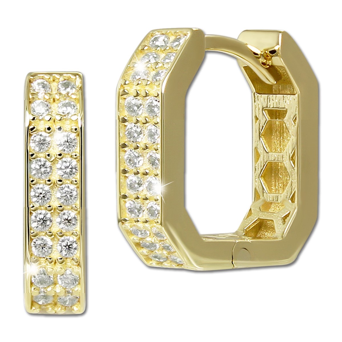 Ein Paar Ohrringe - Creole Karree small - aus 333er Gelbgold. Die Größe der 8 Karat Ohrringe beträgt ca. 10mm x 10mm und sie sind mit weißen, funkelnden Zirkonias besetzt. Die Creolen sind aus unserer einzigartigen GoldDream Echtschmuck Kollektion.