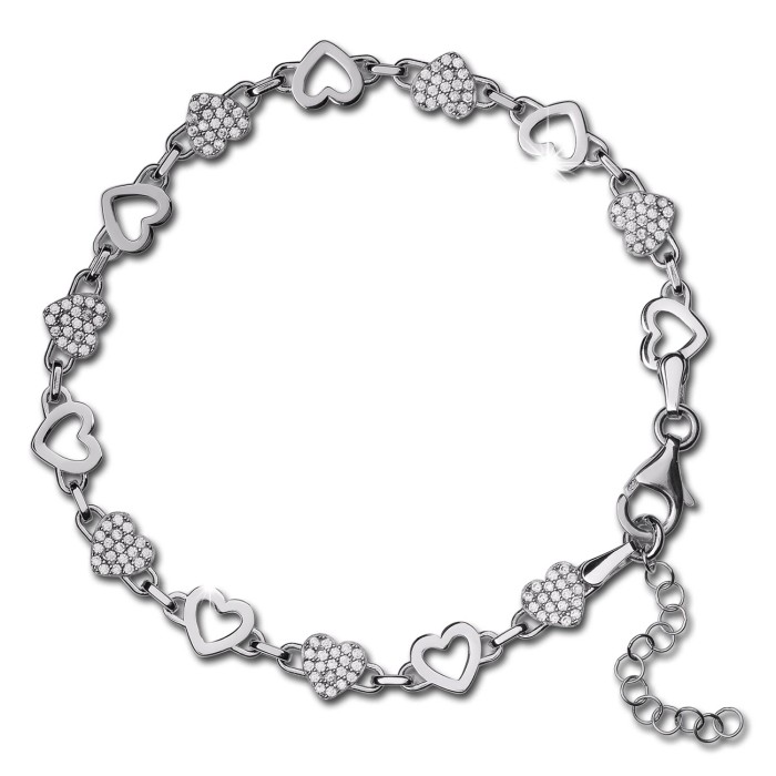 Ein edles Armband aus Gliedern in Herzform mit ca. 19cm - 21,5cm Länge mit Karabinerverschluss. Die Herzen sind abwechselnd offen und voll mit Zirkonia besetzt. Es ist aus der einzigartigen SilberDream Schmuck Kollektion und aus allergenfreiem, anlaufgeschütztem und poliertem 925 Sterling Silber.