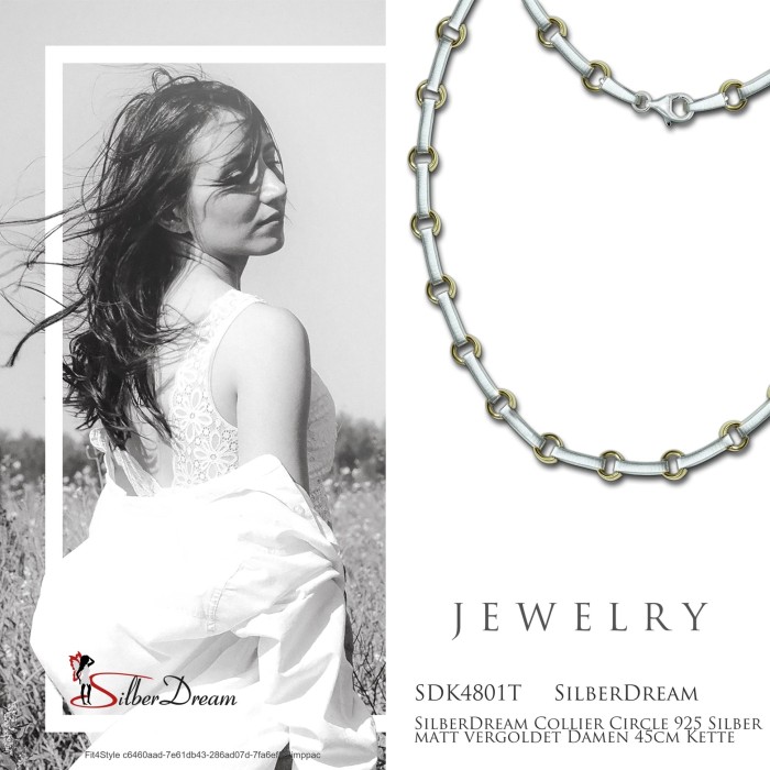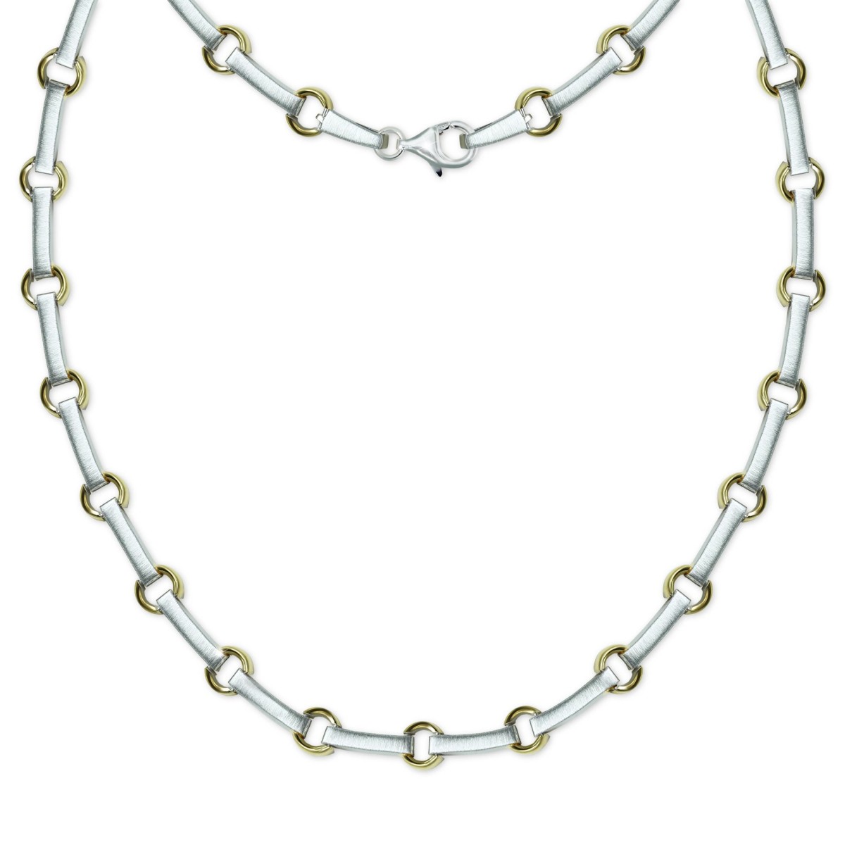Eine moderne Collier Halskette Circle in der Länge 45cm mit einem Karabinerverschluss. Es wechselt sich ein mattiertes Element mit einem vergoldetem Element ab. Das Collier ist aus der einzigartigen SilberDream Schmuck Kollektion und aus allergenfreiem 925 Sterling Silber. Diese Halskette ist auch im Set (mit Armband) erhältlich.
