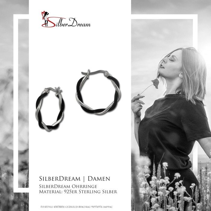 Ein Paar Creolen geflochten und teilweise geschwärzt, Damen Ohrringe aus der SilberDream Schmuck Kollektion aus anlaufgeschütztem 925 Sterling Silber. Die zweifarbigen Ohrringe sind zum Teil mit schwarzen Emaille Lack überzogen. Die Creolen haben einen Durchmesser von ca. 2,5cm.