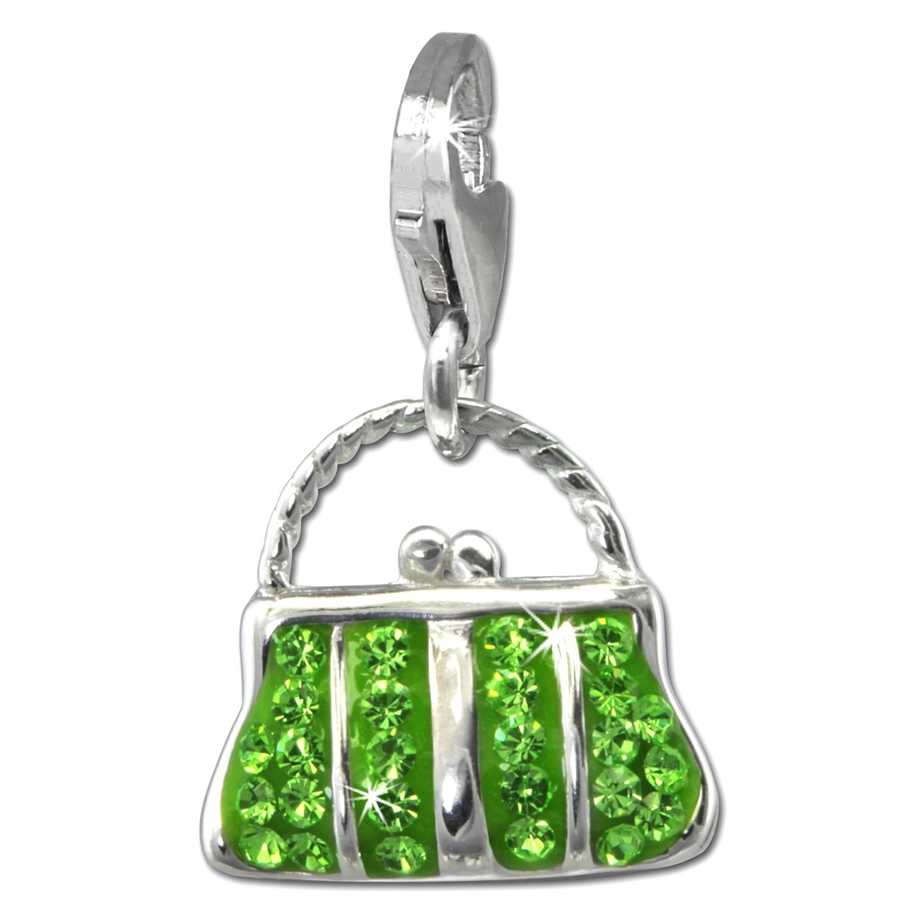 - Tasche groß hellgrün - ein Glitzer Charm mit tschechischen Kristallen und aus 925 Sterling Silber für Bettelarmband oder Halskette. Der funkelnde Anhänger passt auch an Armbänder anderer Hersteller oder kann als Kettenanhänger oder Anhänger für ein Handy genutzt werden. Die Zirkonia Kristalle erstrahlen auf dem Charm in der Farbe hellgrün.