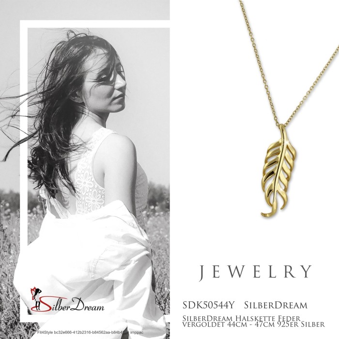 Eine zarte Halskette mit einem Anhänger Feder vergoldet aus poliertem 925 Sterling Silber und einer 333er Gelbgold Vergoldung. Das Collier hat eine Länge von 44cm bis 47cm und ist aus unserer SilberDream Silberschmuck Schmuck Kollektion.