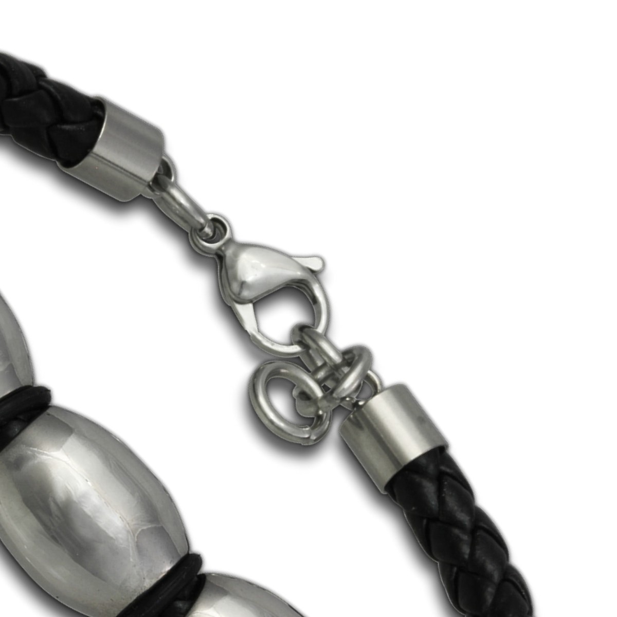 Lederarmband Perle geflochten schwarz mit Edelstahl Beads und Karabinerverschluss.