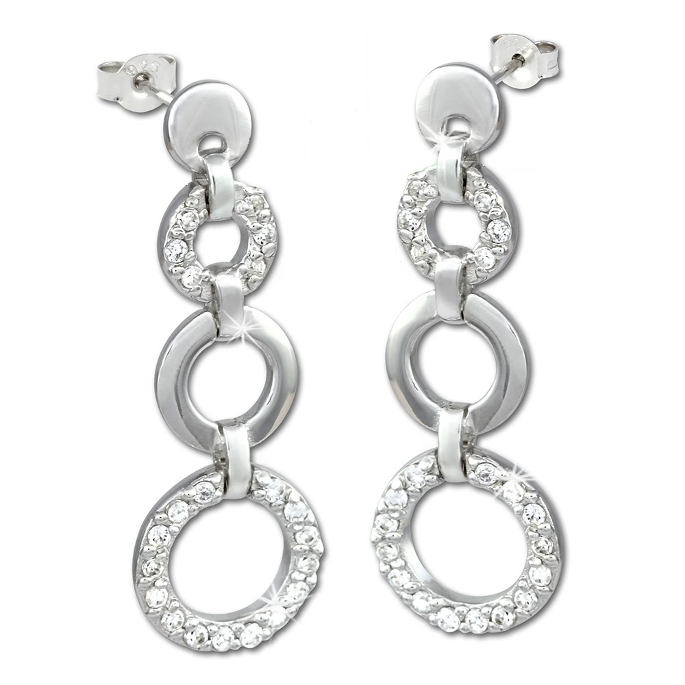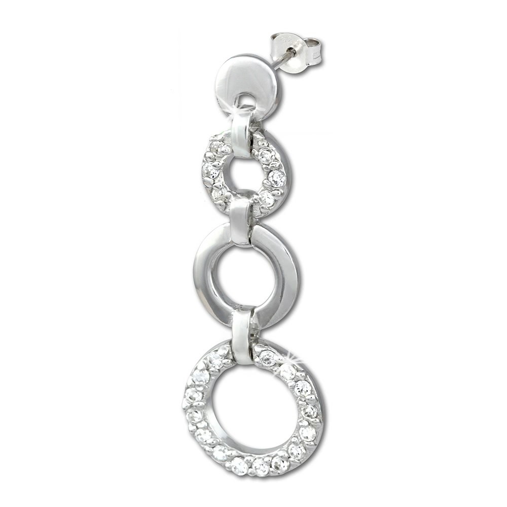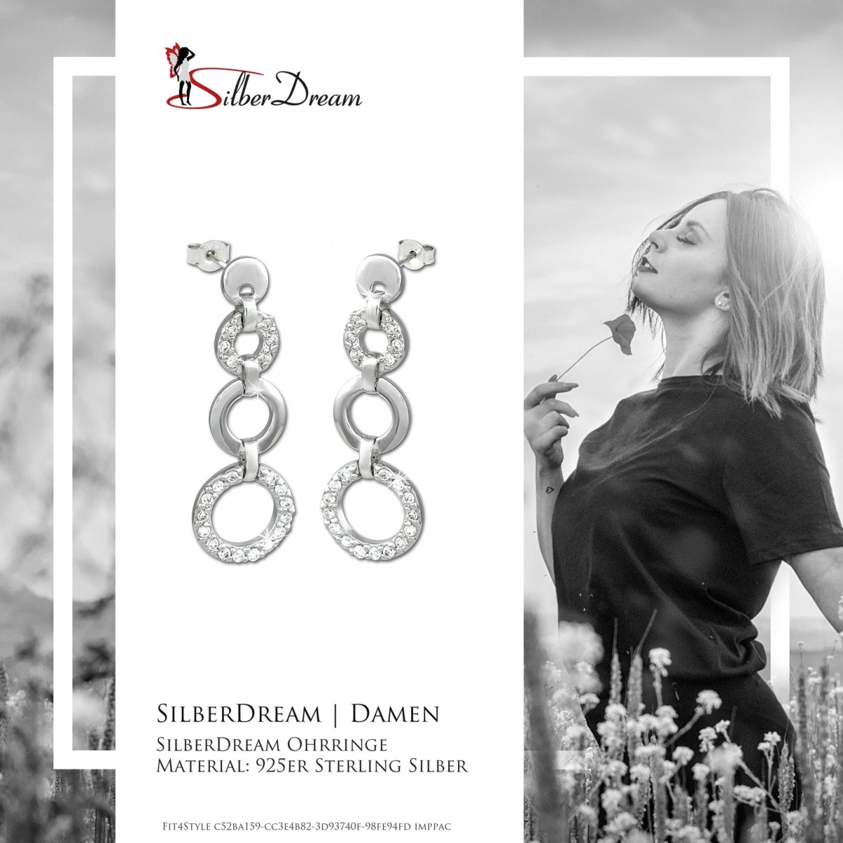 Ohrstecker drei Kreise ca 30mm Länge aus poliertem 925 Sterling Silber. Die Ohrringe drei Kreise mit weißem Zirkonias sind aus der SilberDream Silberschmuck Schmuck Kollektion.