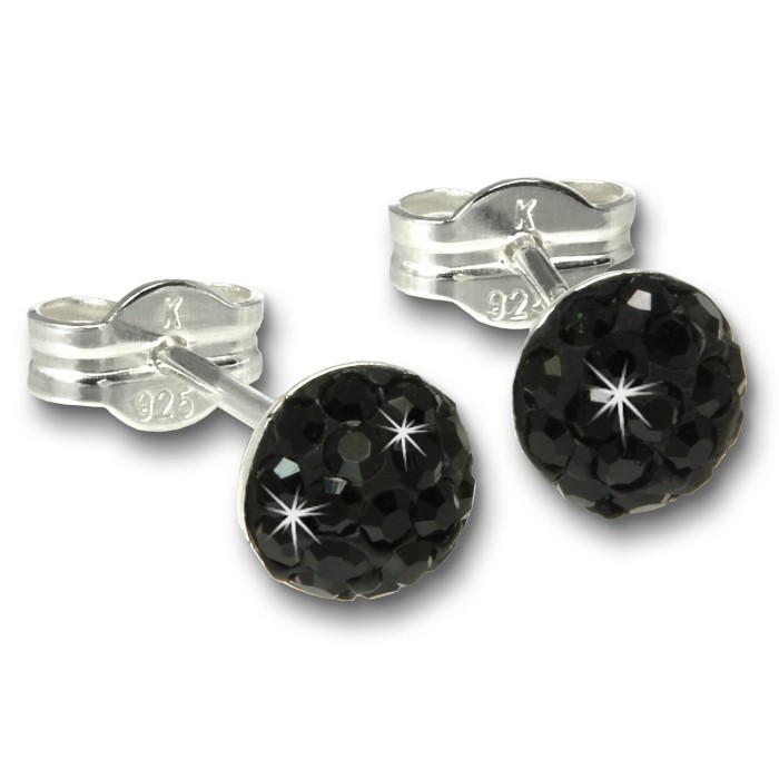 Ein Paar Ohrringe Halbkugel mit tschechischen Preciosa Kristallen - Ohrstecker Zirkonia shiny schwarz - aus 925 Sterling Silber. Die Glitzer Kristalle funkeln auf dem Ohrring im klarem schwarz.