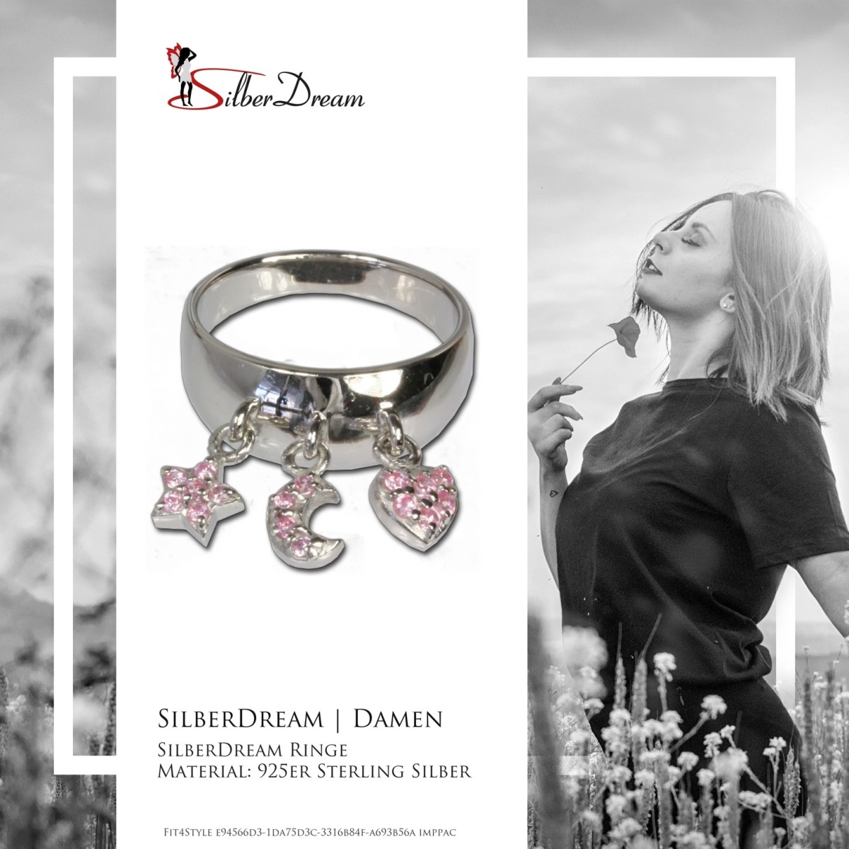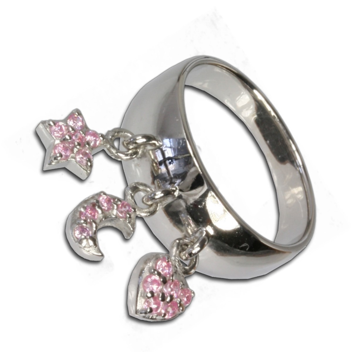 Silberring - Dangle Trio Herz, Mond und Stern aus syn. Zirkonia pink - aus unserer einzigartigen SilberDream Kollektion aus anlaufgeschütztem 925 Sterling Silber.